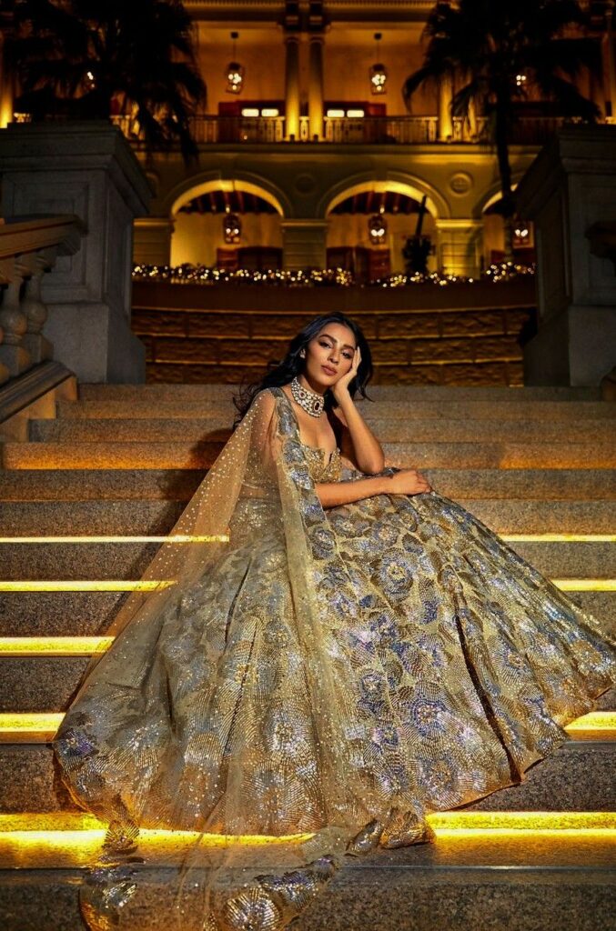 A luminous lehenga adorned with intricate metallic florals, exuding regal elegance and timeless charm. The flowing silhouette paired with a sheer dupatta adds grace and soft movement to every step. Perfect for grand celebrations, it captures luxury with a subtle, radiant glow.