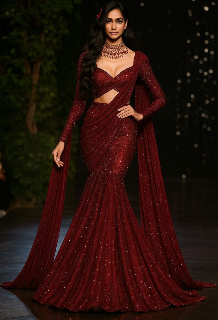 A captivating deep red draped gown with a shimmering finish and a sculpted, figure-hugging silhouette. The sweetheart neckline and subtle cut-out detail add a modern, alluring touch to the traditional drape. Flowing sleeves and a graceful train enhance its regal, evening-ready elegance.